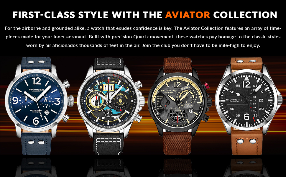 Featuring the ultra accurate precision of Japanese quartz movement indicating day of the week and month this Aviator soars above the rest with unparalleled comfort Featuring bold rivets and brushed stainless steel signed tang buckle this juggernaut hugs the wrist with style thanks to the leather strap Combining the classic aviator style you know and love with Stuhrlings sensibilities this timepiece dares to be bold